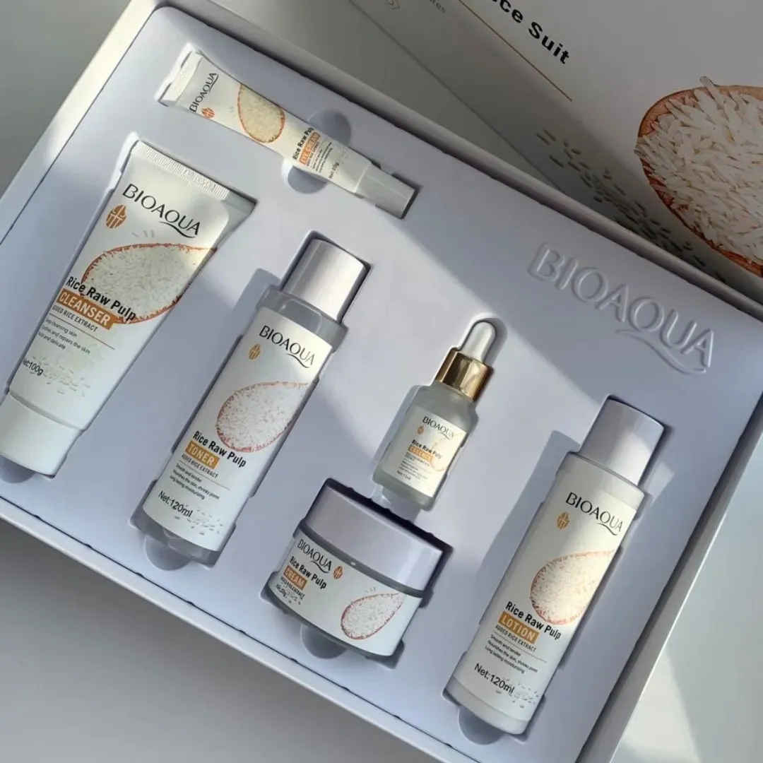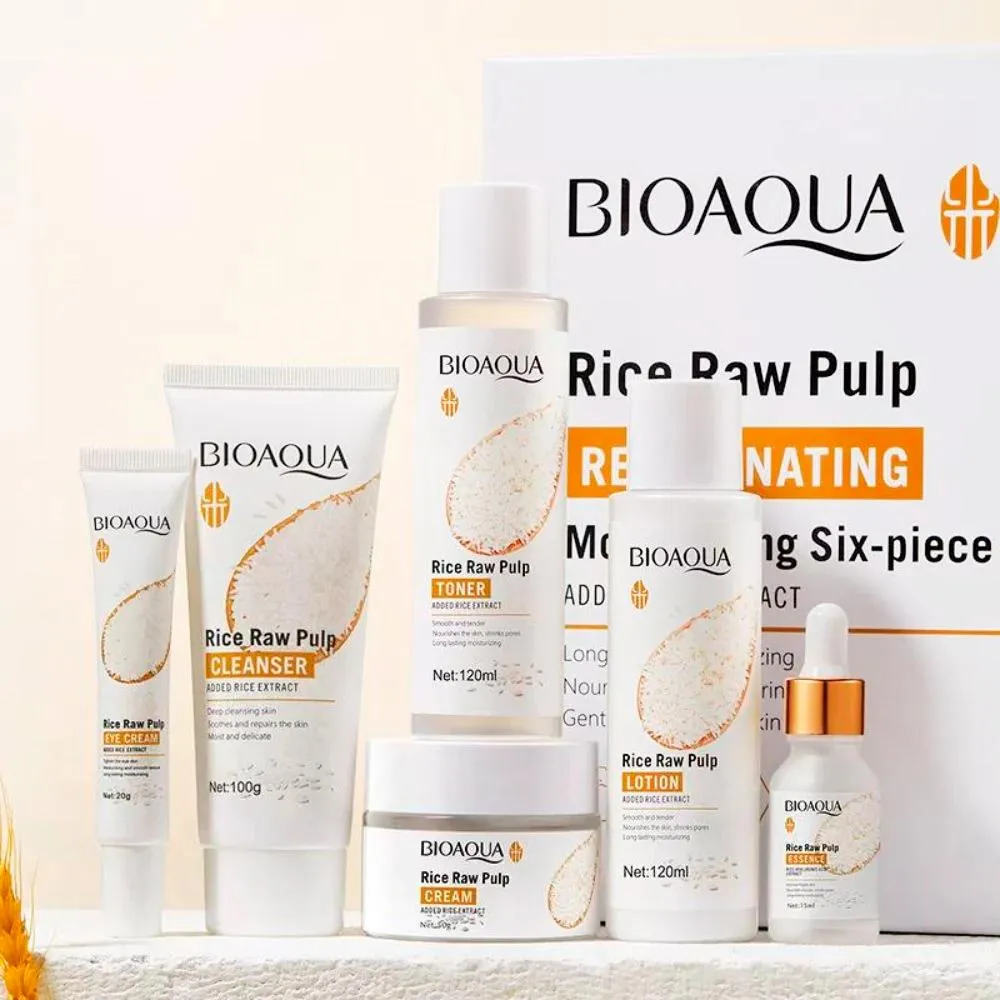 Bioaqua Rice Raw Pulp Rejuvenating – Moisturizing Six-Piece Suit. Es un kit de skincare a base de extracto de arroz, diseñado para hidratar, iluminar y rejuvenecer la piel.